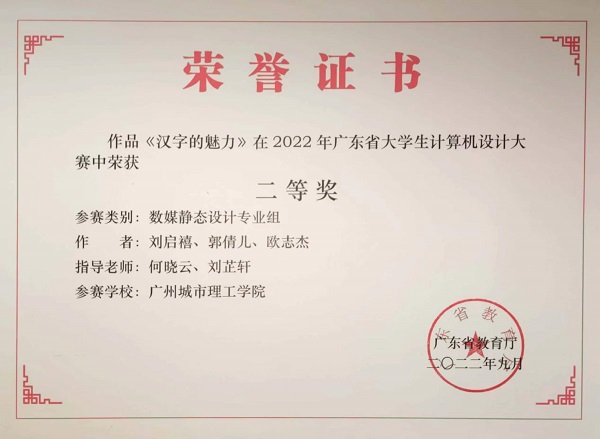 大赛以三级竞赛形式开展,分别是校级赛——省级赛(简称“省赛”)——国家级赛(简称“国赛”)。由工业设计专业刘启禧、郭倩儿、欧志杰三位同学共同创作的数媒静态设计专业组作品《汉字的魅力》在六月中旬的省赛中荣获二等奖,并在七月下旬的国赛中荣获三等奖。
