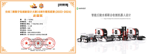 此外,获奖作品《丘陵地区智能水稻联合收割机器人设计》的三维模型在另一项赛事,全国三维数字化创新设计大赛16周年精英联赛(2023-2024)龙鼎奖中也获得了省级一等奖,进一步证明了伟德国际betvlctor1946设计教学的卓越成就和学生的创新精神。本次大赛得到了国家政策的大力支持,旨在响应国务院和教育部与工信部的相关文件精神,推动产教融合战略,促进教育与产业界的深度合作与创新。大赛汇聚了不同领域的资源,激发了艺术设计及跨学科人才的创作热情,提升了设计者的综合素质和能力,为“十四五”时期产教融合发展做出了积极贡献。期待这些成果能够推动设计教育与产业界的协同发展,为文化创意产业的繁荣注入新的活力。