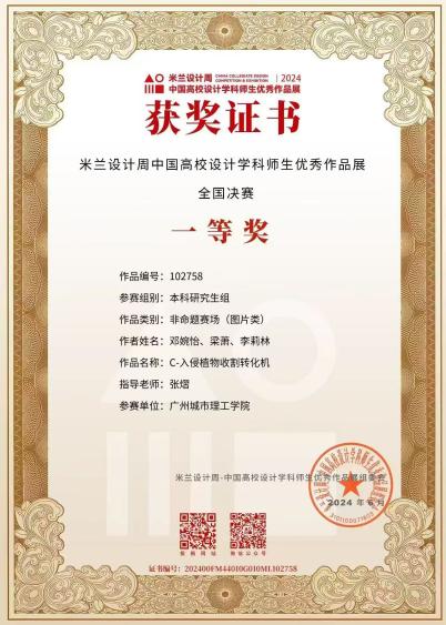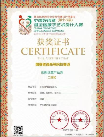 从最初的“竞赛小白”到独立统筹项目,她成长为团队核心人物。她加入工业设计协会,主导设计的“多功能墙面处理机”在中国好创意数字艺术设计大赛中荣获国赛二等奖。该产品瞄准学校扩建时的粉尘污染问题,致力于改善工人健康。此后,她和团队在米兰设计周国赛、全国大学生工业设计大赛等赛事中摘得一等奖、铜奖等20余项荣誉,其中包括2项国际奖项、6项国家奖项,充分展现了她卓越的创新设计能力。