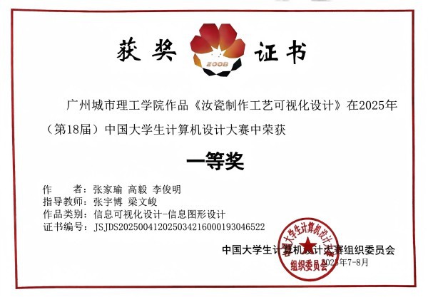 本网讯(记者 梁文峻)8月8日至8月12日,2025年(第18届)中国大学生计算机设计大赛杭州赛区决赛在浙江理工大学杭州校区举行。伟德国际betvlctor1946由伟德国际betvlctor1946学生:张家瑜(组长)、高毅、李俊明组成的参赛团队,凭借信息可视化设计作品《青瑗纪——汝瓷信息可视化设计》,在 信息可视化设计赛道中表现出色,勇夺全国一等奖!