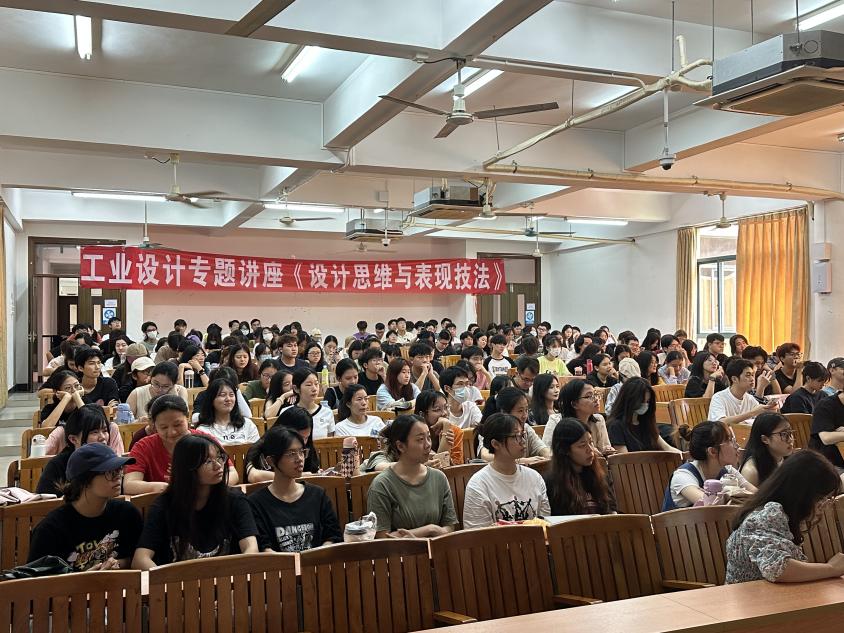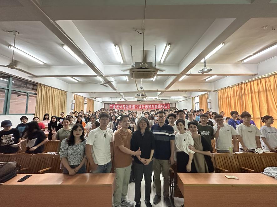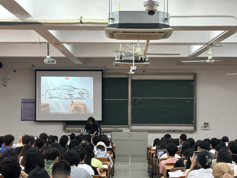 会后,石上源教授在A5-110举行了一场《设计思维与表现技法》的专题讲座。讲座由工业设计教研室主任梁文峻主持,偌大的教室座无虚席,石上源教授结合自己多年的实战经验,由制图、透视和线条说起,首先温习了一遍工业设计草图基础,然后分别以产品设计、汽车设计、鞋类设计、时尚设计等四个类别,详细讲解了从创意形成到概念草图,再到最终方案细节表现等设计过程中需要运用的设计思维与方法流程。